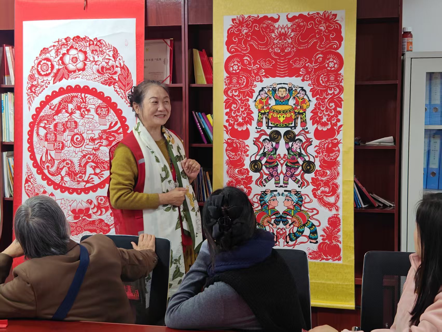 曹静老师首先向居民们介绍了剪纸的历史文化和创作技巧,从折纸方法到纹样设计,耐心演示了传统剪纸的全过程。