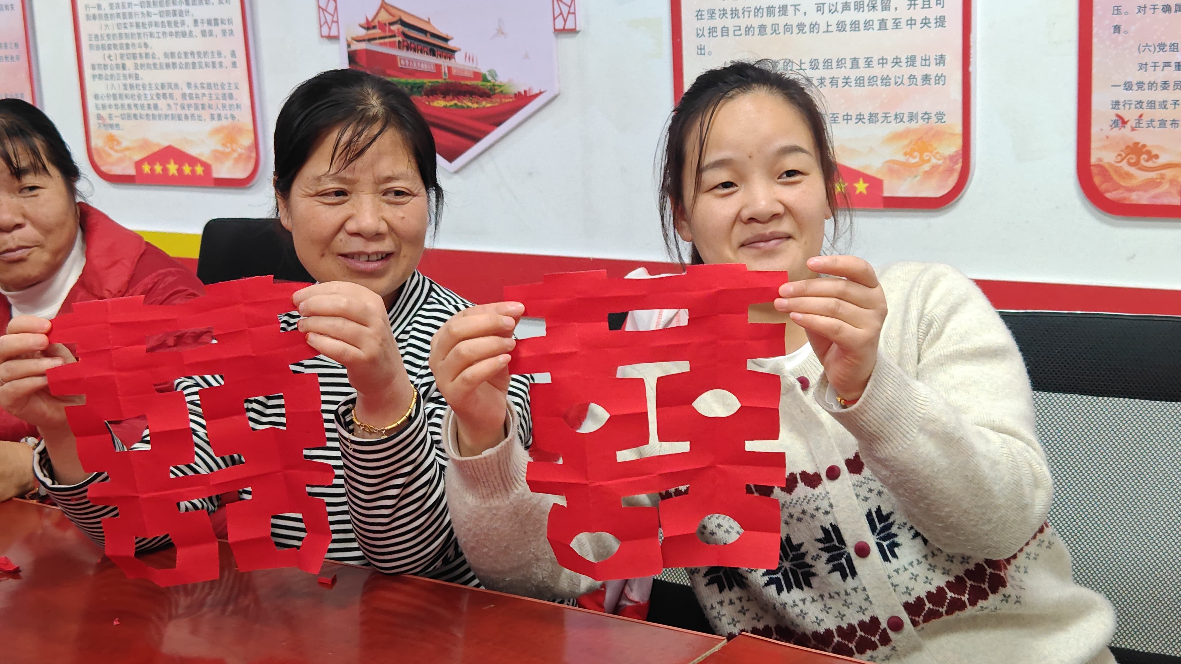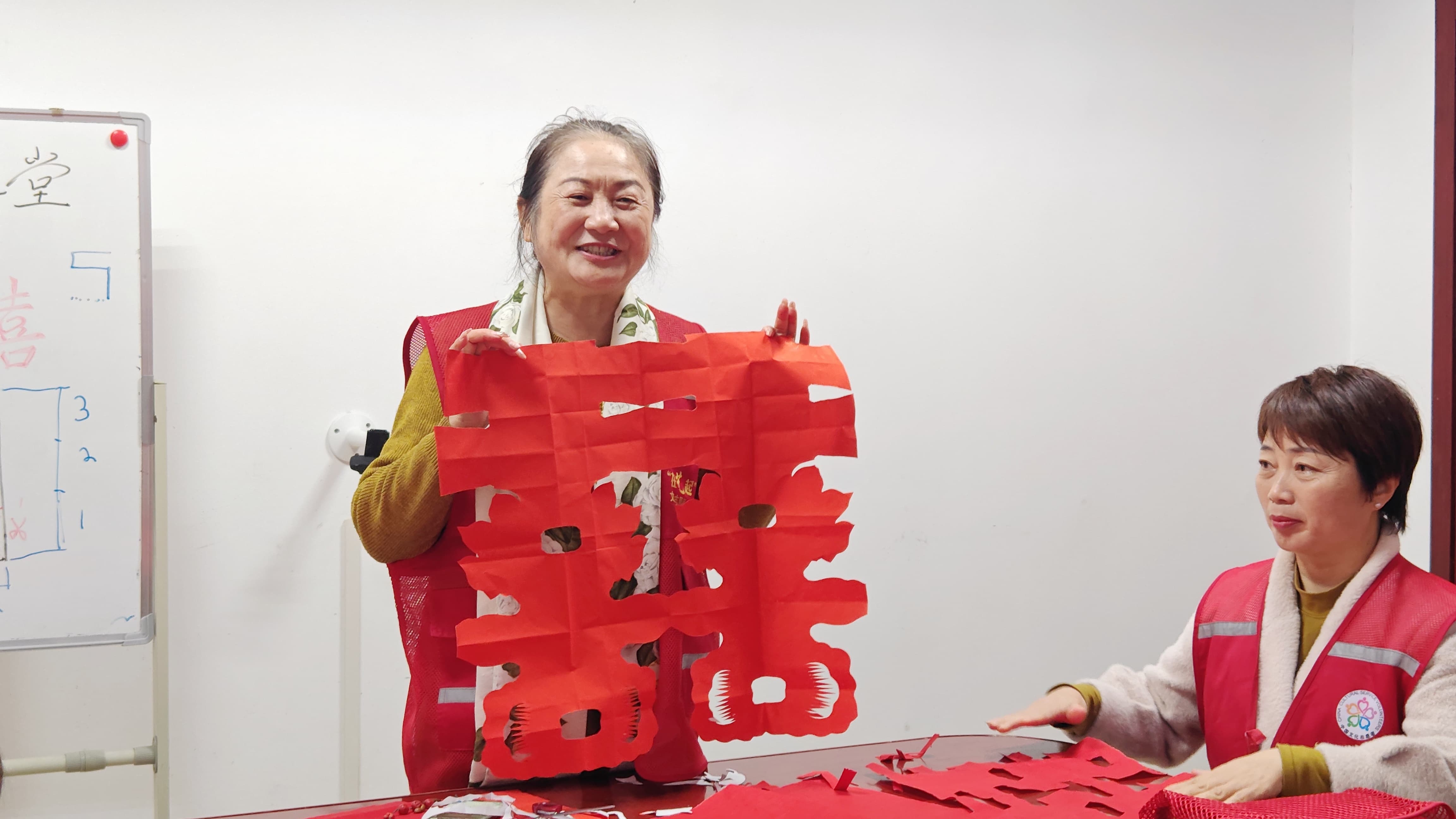 随后,活动进入高潮环节——曹老师现场展示“蒙眼盲剪纸”绝技。只见她蒙上双眼,仅凭指尖触感和多年经验,手中的红纸在剪刀翻飞间逐渐化作一幅精美的“囍”字图案,引得居民连连惊叹。在曹老师的指导下,大家纷纷尝试基础剪纸创作,从简单的窗花到复杂的花鸟图案,现场气氛热烈,欢声笑语不断。